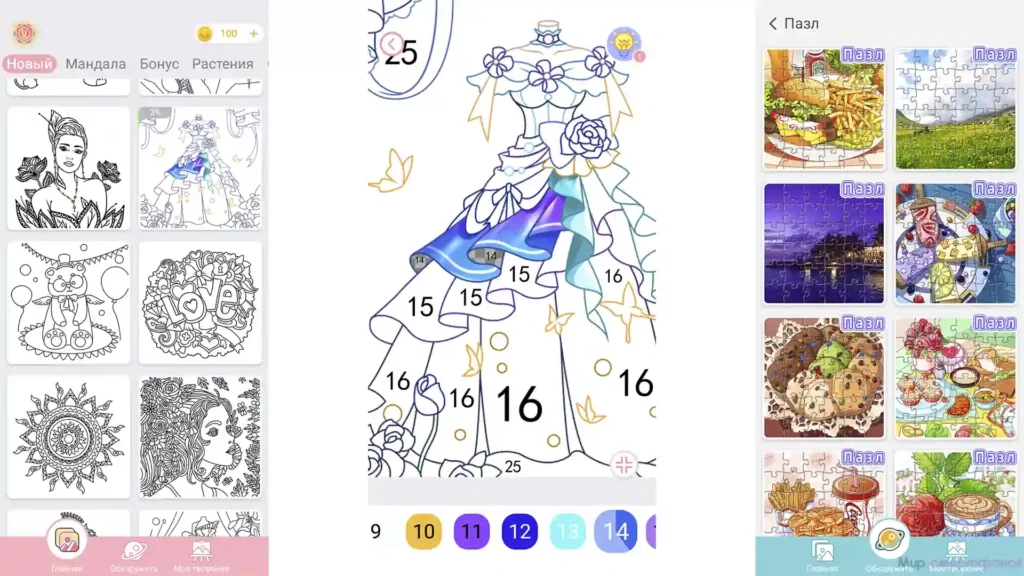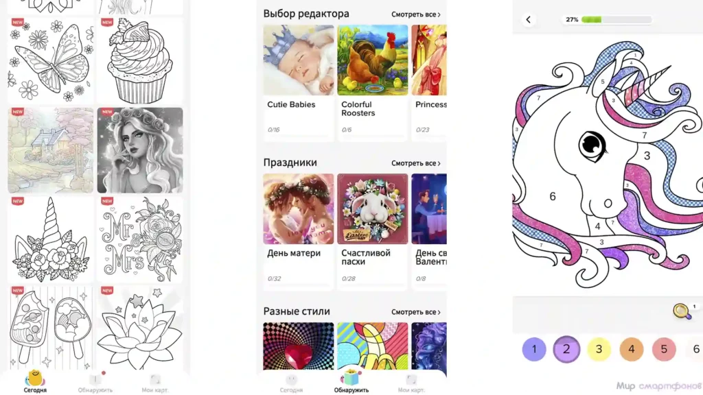 Продвинутая раскраска по номерам имеет огромный каталог картинок, распределенных по разным разделам. В приложении нашлось место самым разнообразным заготовкам. Среди них есть как аниме или мандалы, так и спиральные раскраски. Также сервис получил дополнительные развлекательные функции.