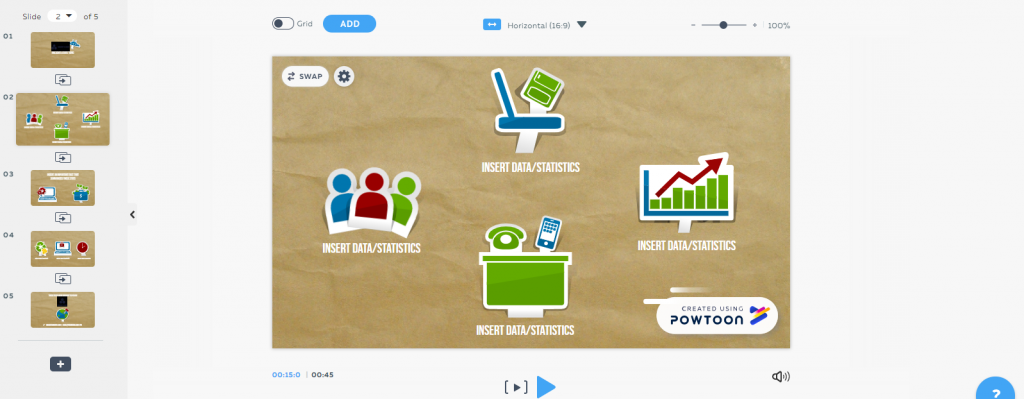 PowerPoint или Сanva от видеоиндустрии. Позволяет создавать видео-презентации из готовых макетов или собирать их с “чистого листа” путем добавления отдельных элементов из меню справа. Целый пласт шаблонов посвящен анимированной инфографике для бизнеса.