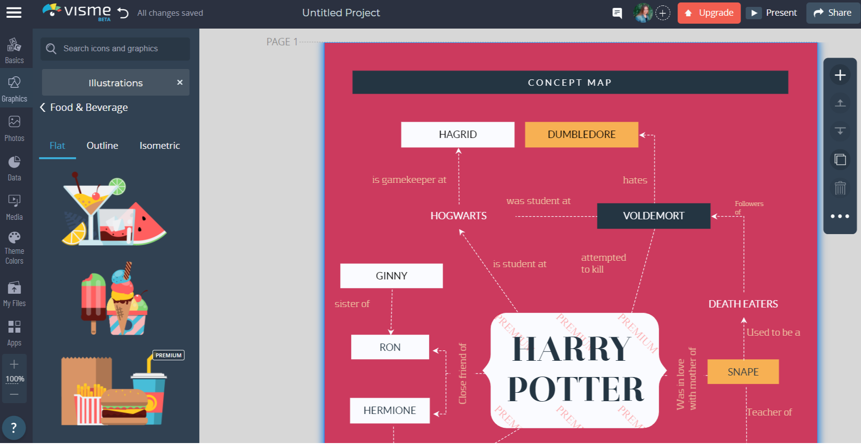 Львиная доля шаблонов закрыта для бесплатного пользования, но и среди открытых есть что выбрать. Для удобства они разбиты на группы по типам: инструкции, сравнение, хронология, диаграммы и т. д. Доступны некоторые виджеты и графики, изображения, иконки и фото. К слову, можно загрузить и свои картинки, но хранилище ограничено – до 100 МБ.