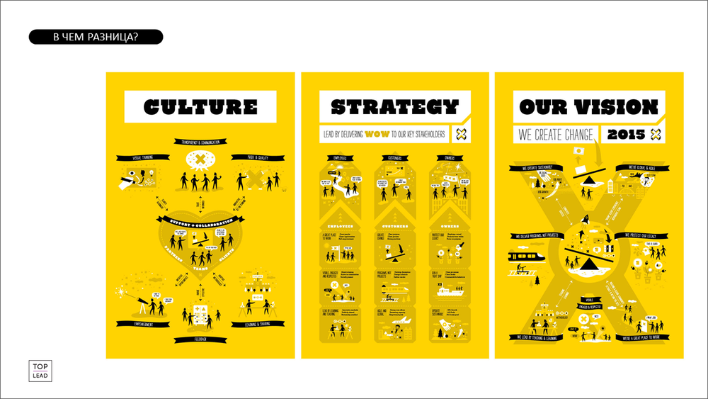Бесспорно, в тексте можно найти более детальное пояснение к тому, что происходит на иллюстрациях, но без них туда вряд ли кто-то вообще заглянет. Визуализация облекает идеи в упаковку, которая отличает одну компанию от другой. К тому же, в таком формате информацией удобнее делиться в соцсетях.