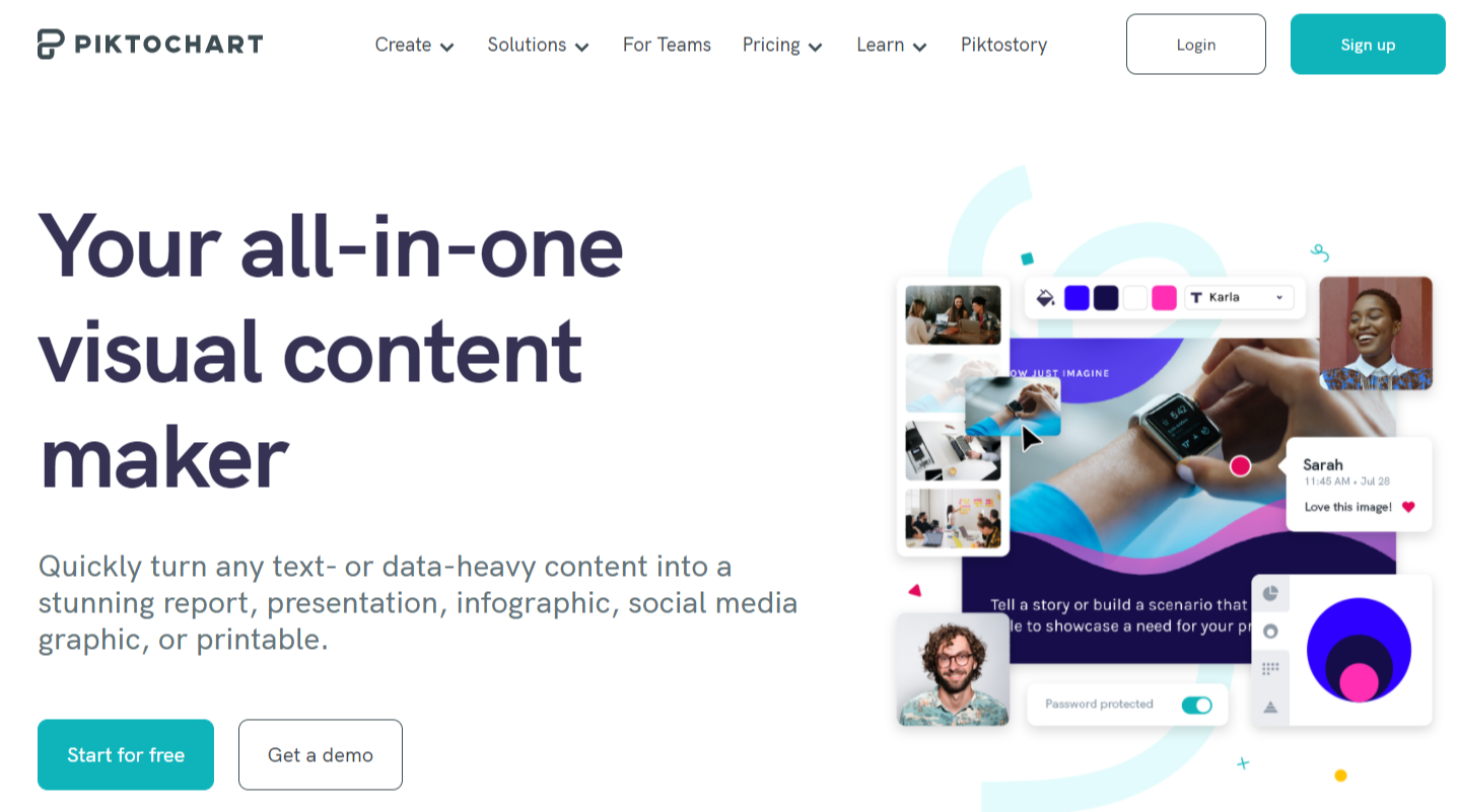 Piktochart является инструментом для инфографики и презентаций, который позволяет превратить скучные данные в захватывающие инфографики с помощью нескольких щелчков мыши. Пользовательский редактор Piktochart позволяет вам делать такие вещи, как изменение цветовой схемы и шрифтов, добавление предварительно загруженного графика и загрузку основных видов и изображений. Шаблоны с линией сетки также упрощают выравнивание графических элементов и пропорции размера изображений.
