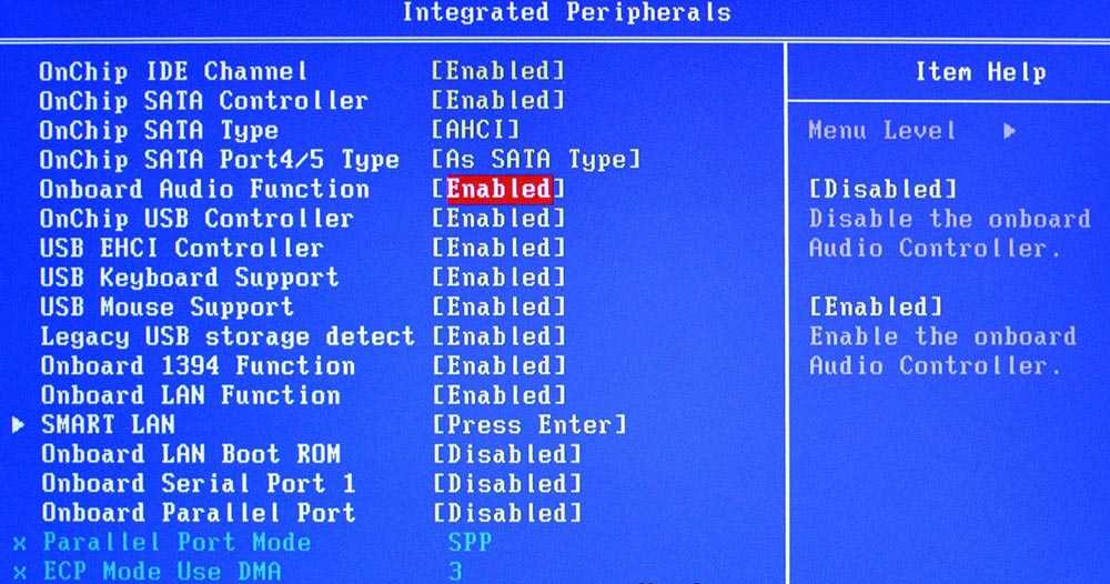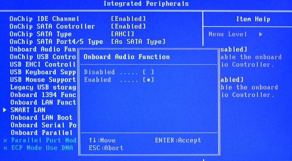 - В разделе «Integrated peripherals» (может называться по-другому) найти опцию «Onboard audio function», «High definition audio» или что-то подобное. Если опция выключена («Disabled»), используя стрелки, перевести ее в состояние «Enabled».