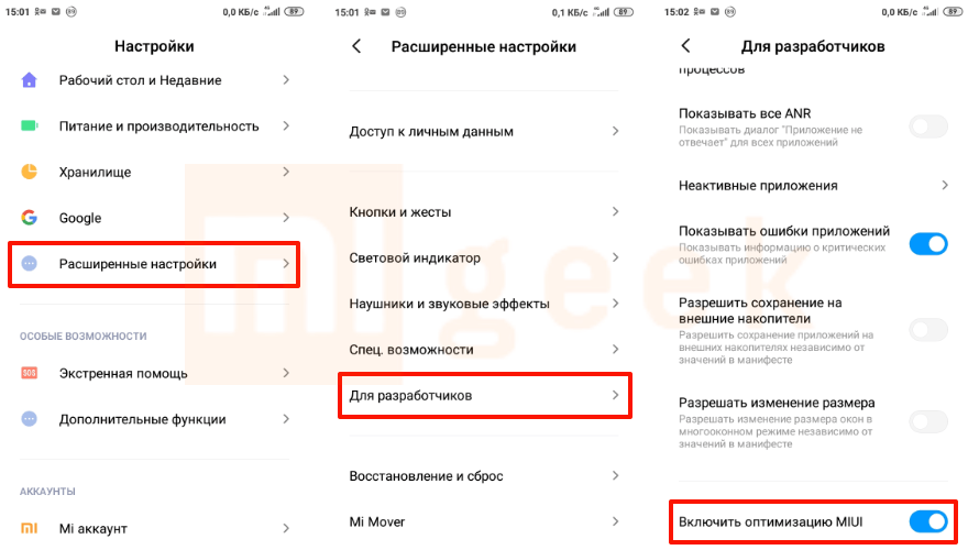 Для отключения пункта «Оптимизация MIUI» нужно перейти в: