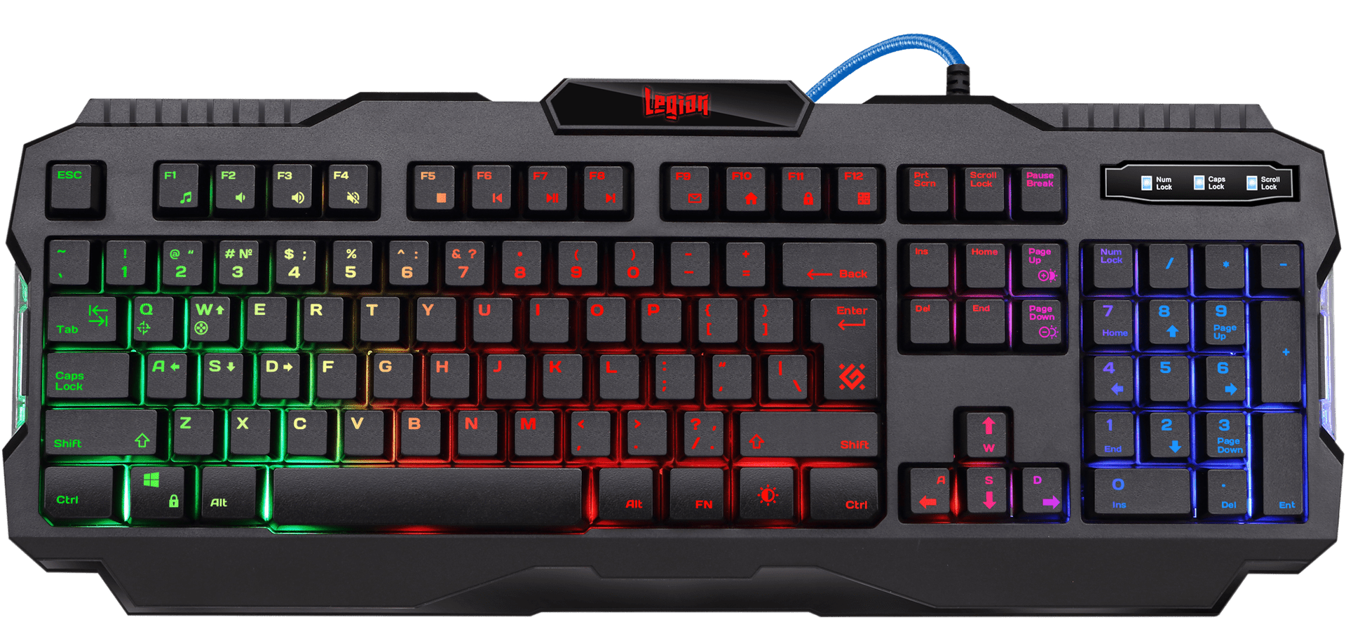 Модель с поддержкой игровых функций и цветной подсветкой (RGB). Клавиши работают на долговечной мембране, а всего их – 104 штуки. В корпусе с габаритами 457×32×185 мм разместился ещё и цифровой блок. Из полезных и создающих комфорт опций – имеется регулировка угла наклона с помощью ножек, и есть возможность подстраивать яркость подсветки. В случае чего имеется возможность выключить её совсем. Подсоединение к компьютеру – через стандартный USB кабель (1,5 м) в защитной оплётке и ферритовым элементом от помех. Из игровых моментов – WIN блокировка, анти-фантомная функция на 19 клавиш, переключение курсора.