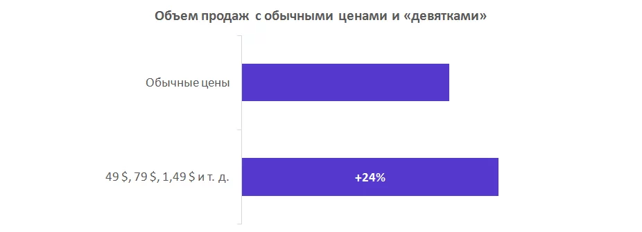 Согласно книге Уильяма Паундстоуна «Это дорого или дешево? Психология цены» с 1987 по 2004 было проведено 8 исследований, которые подтверждали, что товары с ценами 49 $, 79 $, 1,49 $ и т. д. продавались в среднем на 24% лучше, чем эти же товары с ближайшими ровными ценами.