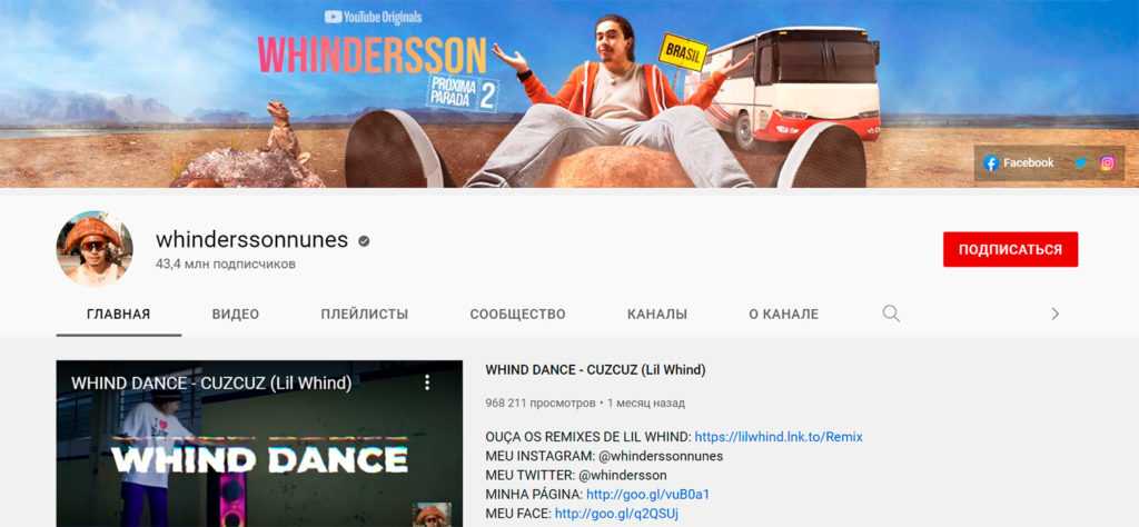| 20 | 8 (2018-2018) | whinderssonnunes | 38.7M | 376 | Португальский |