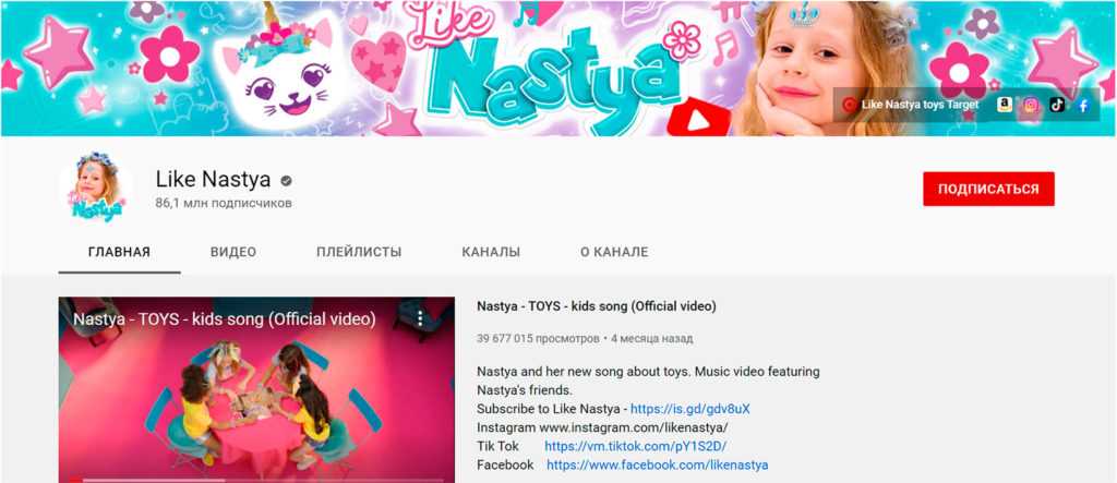 | 11 | 11 (2019 — н.в.) | Like Nastya | 49.4M | 384 | Русский |