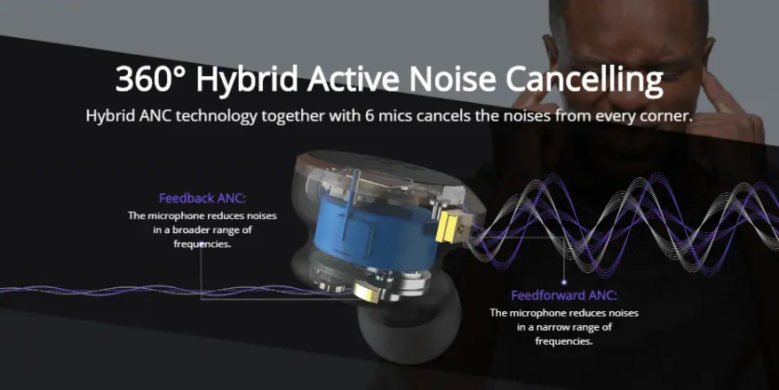 Tronsmart Apollo Bold headphones are equipped with ANC Active Noise Cancellation. The principle of operation of this technology is as follows: microphones pick up ambient noise, a chip built into the headphones generates sound with the same amplitude, but with a reverse (inverted) phase, then these two waves are superimposed on each other, this actually leads to a decrease in the noise level.
