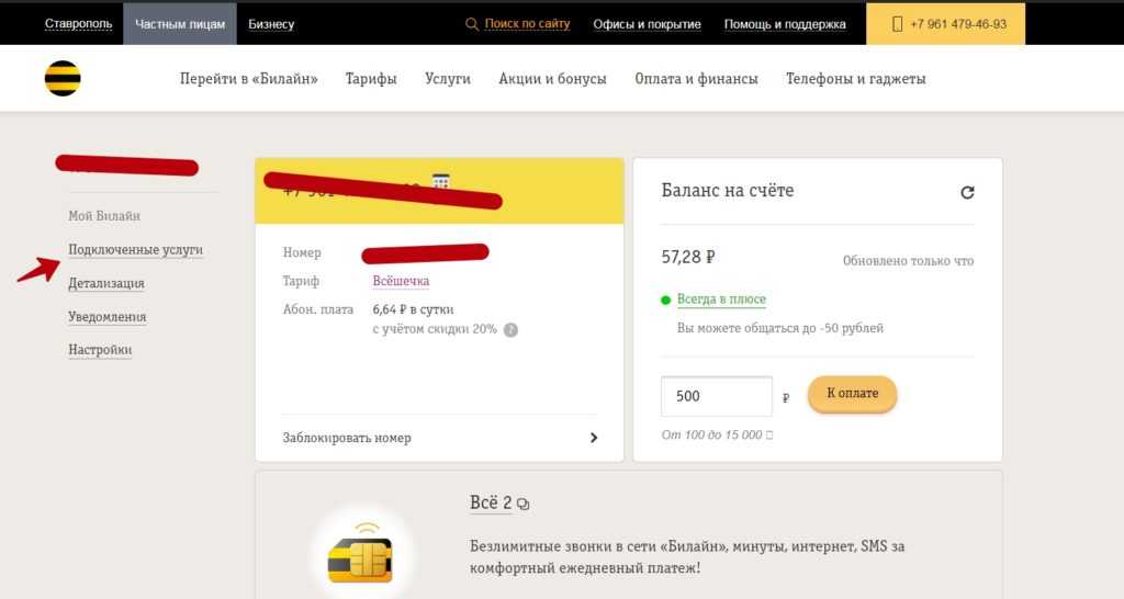 - На сайте beeline.ru. Для проверки активных подписок на сайте, в первую очередь необходимо пройти авторизацию. Для авторизации необходимо ввести номер телефона и пароль, который придёт в сообщении. После авторизации перейдите в раздел «Имеющиеся услуги». В этом разделе будет представлена информация обо всех подключённых услугах. Здесь же вы сможете легко отключить или подключить необходимые опции.