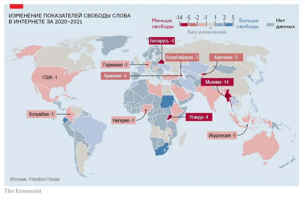 Современные технологии все чаще сочетаются с законами, ограничивающими свободу слова. В прошлом году как минимум в 55 из 70 стран, ситуацию в которых мониторит Freedom House, были проведены аресты или вынесены приговоры за посты в соцсетях. Это самые высокие показатели за 11 лет.