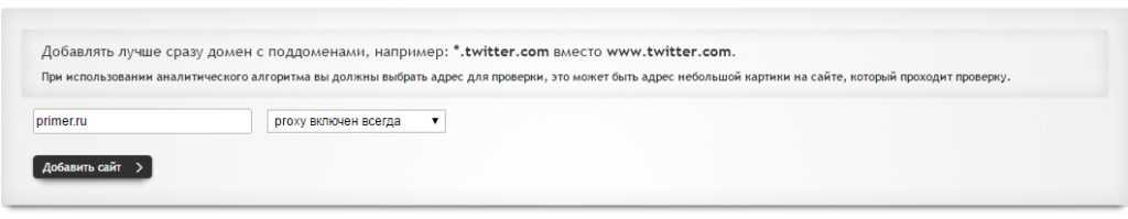 Кликнув на созданную папку, откроется окно для добавления пользовательских порталов. Будьте внимательны, если у сайта есть много поддоменов, к которым необходим доступ, то нужно указать «*.example.com». Это значит что кроме example.com будет открываться, например, games.example.com. Рядом находятся режимы работы: аналитический и proxy всегда включен. Второй режим означает, что сайт будет запускаться с proxy всегда. Аналитический же, наоборот, будет проверять доступ к ресурсу. Например, если провайдер по ошибке заблокирует сайт, то потом он может снова вернуть к нему доступ. Тогда дополнение не будет на нем работать. Если есть уверенность в том, что доступ к сайту точно не вернется, то лучше ничего не трогать.
