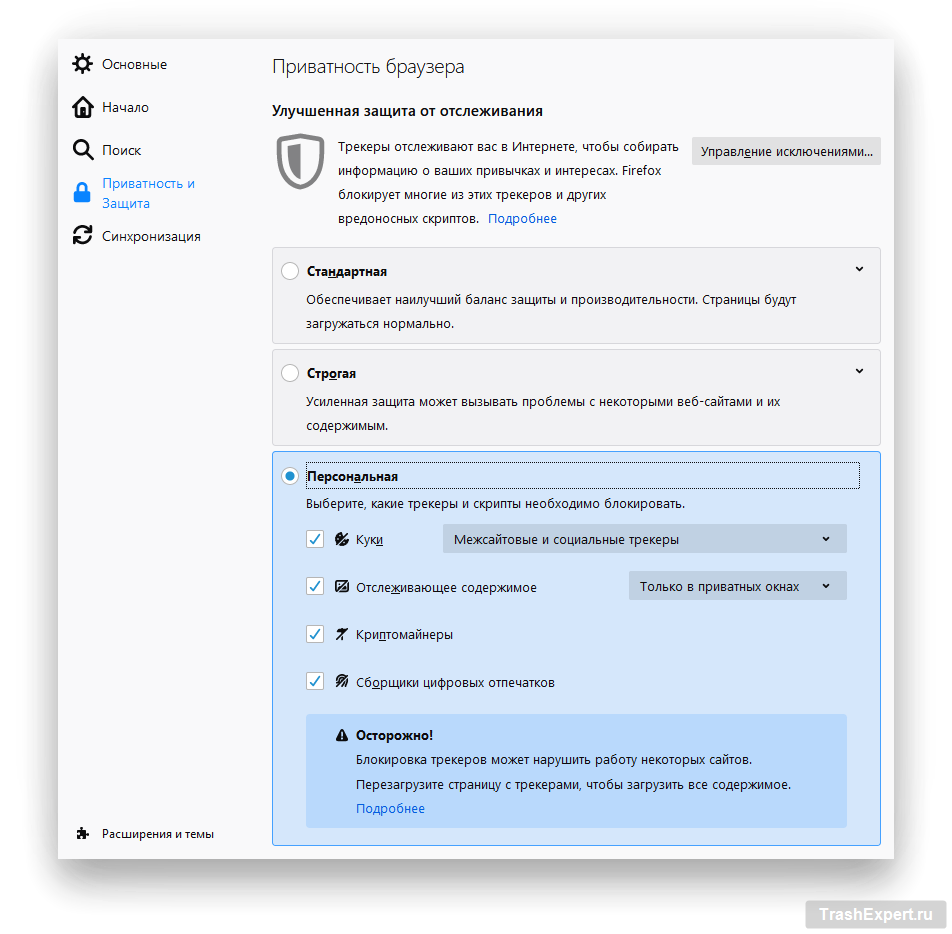 В разделе настроек «Приватность и защита» есть много полезных опций для обеспечения различных уровней конфиденциальности: «Стандартная», «Строгая», «Персональная».