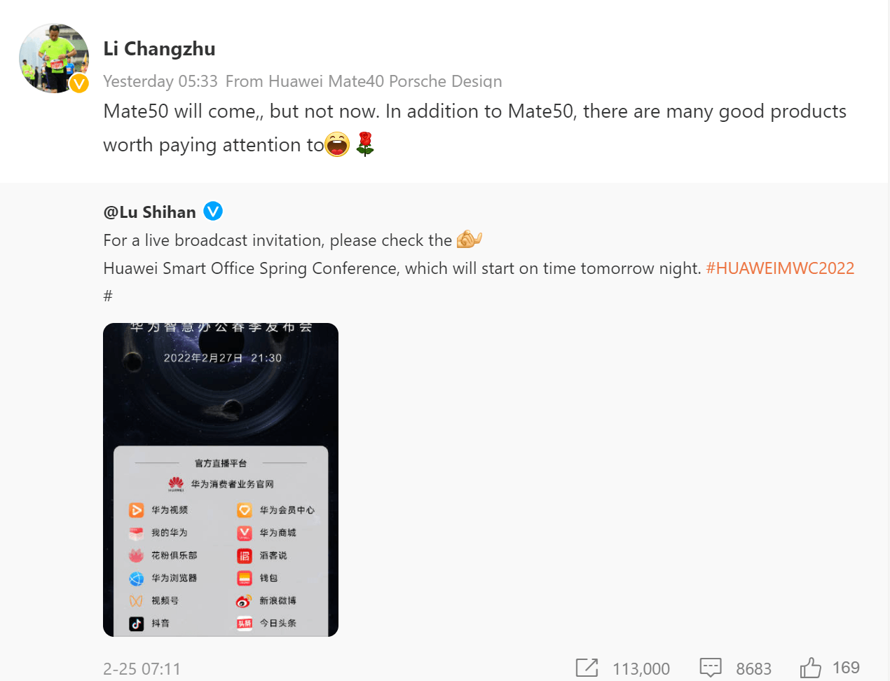 Информация о том, что новый смартфон все же будет, поступила не от рядового сотрудника или источника утечек, а от вице-президента отдела маркетинга потребительской бизнес-группы Huawei Ли Чанчжоу. Он заявил, что Huawei Mate 50 действительно станет реальностью. Это заявление, по-видимому, положило конец разговорам о том, что семейство Mate 50 никогда не станет реальностью.