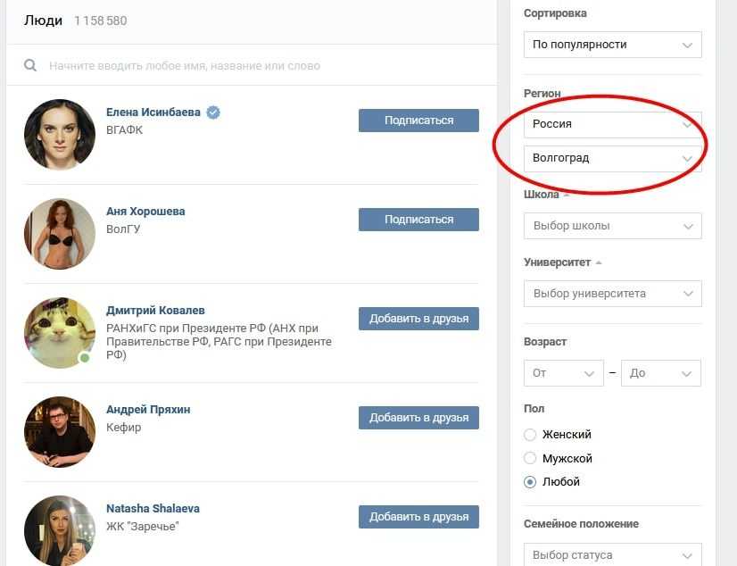 Ещё один вариант поиска – по городу. Чтобы указать конкретный город при поиске человека в ВКонтакте, пользователю нужно будет следовать такому порядку действий: