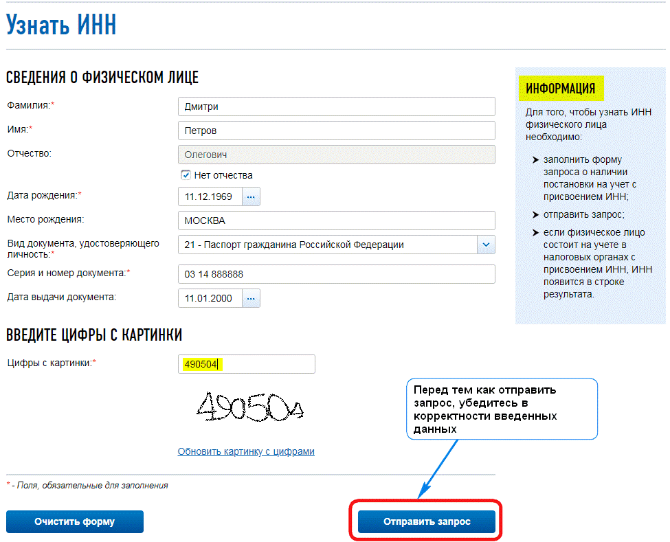 Способ 2. Еще с помощью сервисов можно убедиться, что паспорт принадлежит конкретному лицу. Для этого необходимо зайти на сайт Федеральной налоговой службы и в пункте «Узнать ИНН» ввести данные нужного вам лица. Система обработает полученную от вас информацию и выдаст ответ. Если ответ некорректный или содержит какие-то ошибки, то данные паспорта недействительные/ложные.