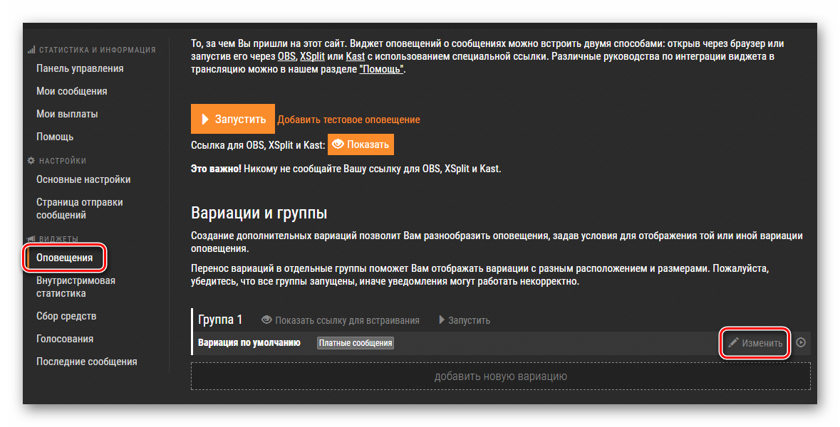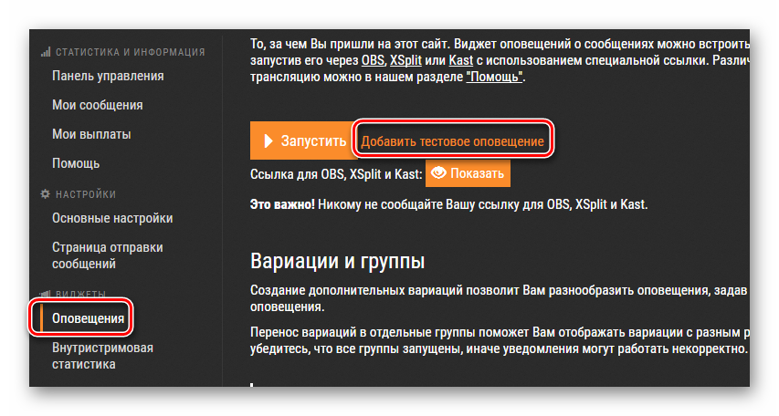 Мы почти разобрались, как вставить донат в OBS. Теперь находим на панели слева раздел «Виджеты» и открываем вкладку «Оповещения» .