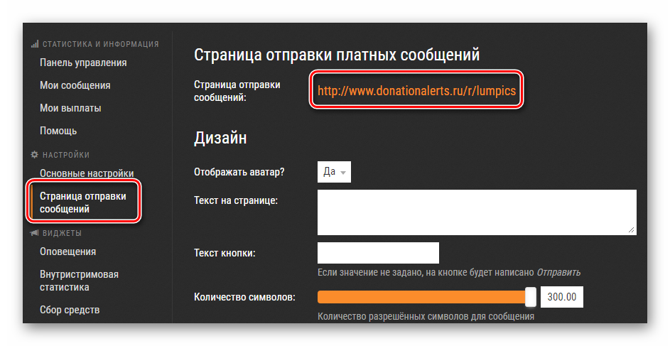 Вот это уже важный раздел настроек. В первой его части находится ссылка, по которой пользователи могут отправлять деньги. Затем идут настройки оформления. В принципе, можно оставить внешнее оформление без изменений, хотя лучше сделать всё в собственном стиле. Здесь же указываются минимальные суммы доната.