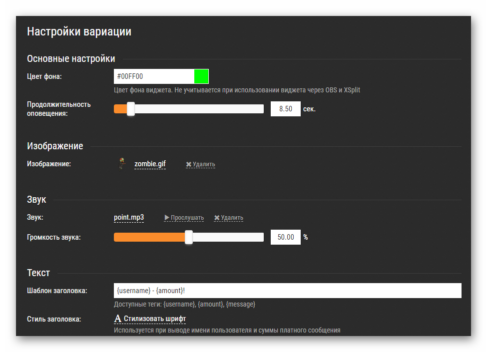 Здесь вы можете настроить разные типы оповещений для разных групп – например, для тех, кто донатит менее 50 рублей и более. Для платных подписчиков или обычных зрителей – выбирайте сами.