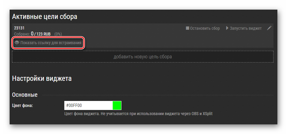 Чтобы зрители видели, что они могут отправлять вам деньги, нужно добавить цель сбора средств.