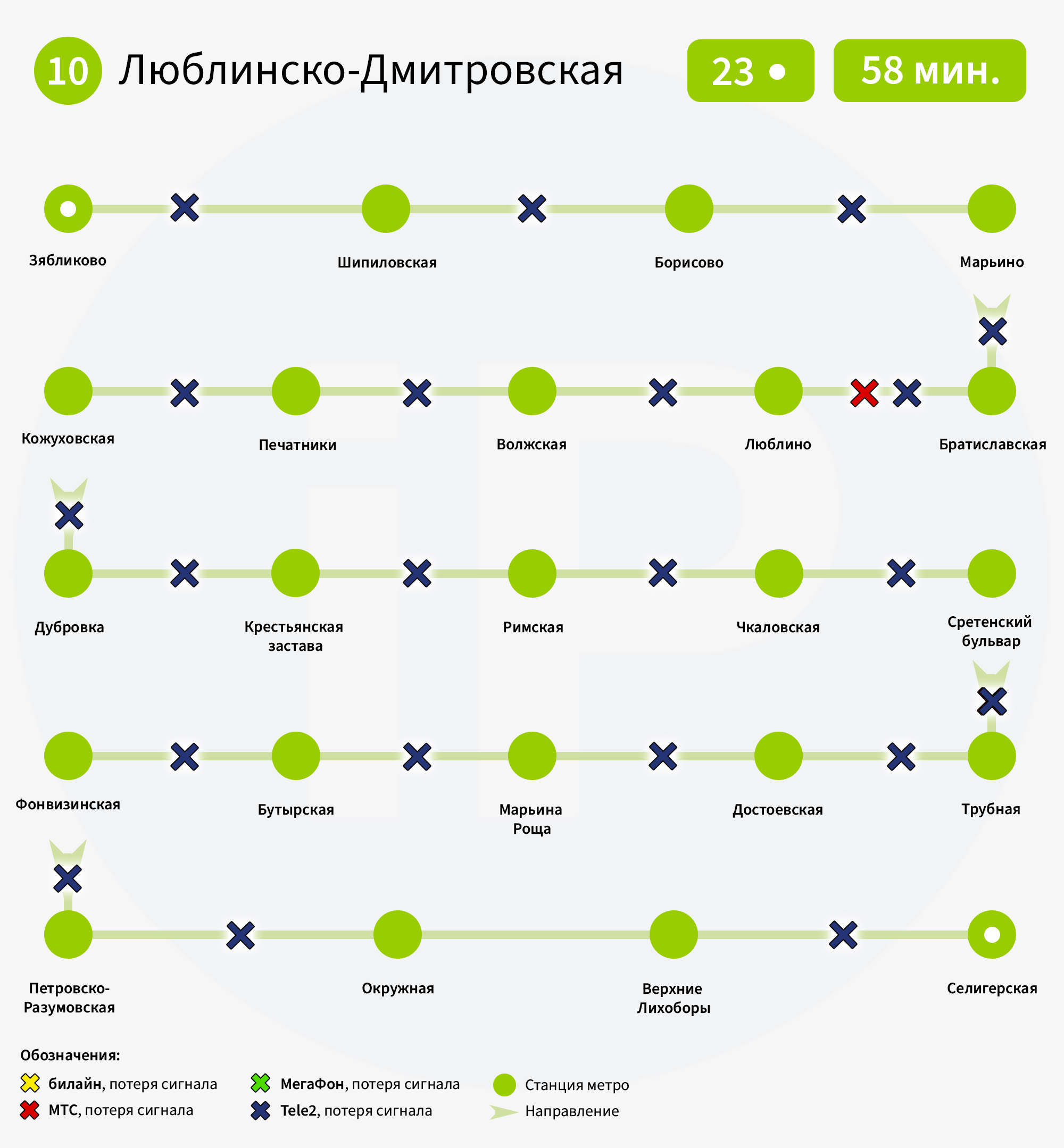 • Tele2: 21 (Зябликово – Шипиловская, Шипиловская – Борисово, Борисово – Марьино, Марьино – Братиславская, Братиславская – Люблино, Люблино – Волжская, Волжская – Печатники, Печатники – Кожуховская, Кожуховская – Дубровка, Дубровка – Крестьянская Застава, Крестьянская Застава – Римская, Римская – Чкаловская, Чкаловская – Сретенский бульвар, Сретенский бульвар – Трубная, Трубная – Достоевская, Достоевская – Марьина Роща, Марьина Роща – Бутырская, Бутырская – Фонвизинская, Фонвизинская – Петровско-Разумовская, Петровско-Разумовская – Окружная, Верхние Лихоборы – Селигерская)