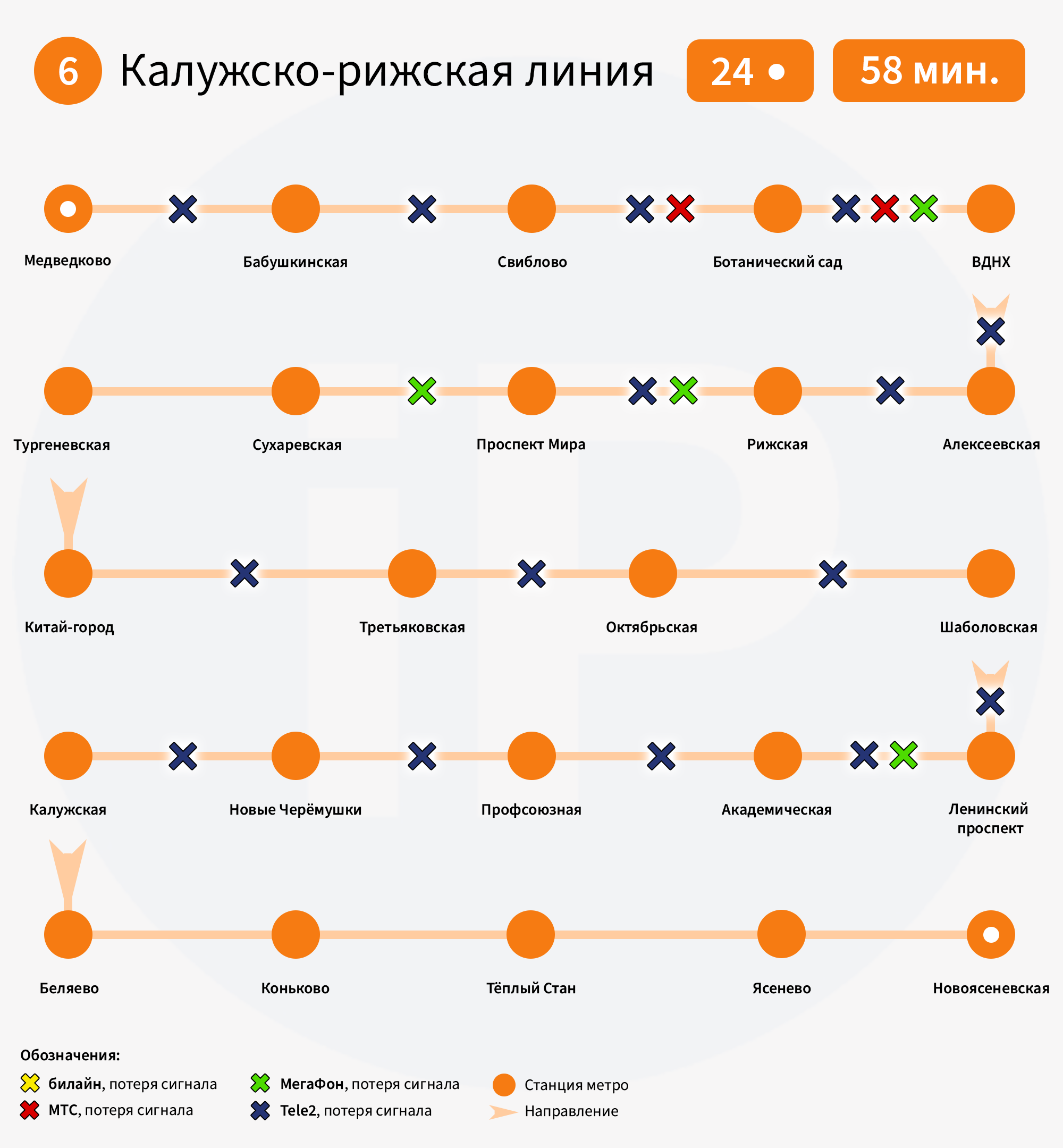 • Tele2: 15 (Медведково – Бабушкинская, Бабушкинская – Свиблово, Свиблово – Ботанический сад, Ботанический сад – ВДНХ, ВДНХ – Алексеевская, Алексеевская – Рижская, Рижская – Проспект Мира, Китай-город – Третьяковская, Третьяковская – Октябрьская, Октябрьская – Шаболовская, Шаболовская – Ленинский проспект, Ленинский проспект – Академическая, Академическая – Профсоюзная, Профсоюзная – Новые Черёмушки, Новые Черёмушки – Калужская)