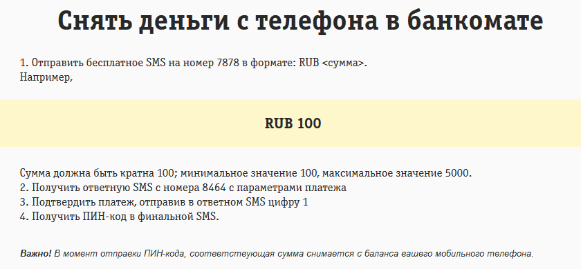 Первый вариант – отправить СМС на уже знакомый номер 7878. Текст сообщения должен содержать название валюты и сумму денег, которую хотите перевести. Выглядеть это может так: «RUB 100». Снять можно не менее 100 рублей. После этого, через некоторое время Вам придет СМС с кодом подтверждения, который позволит снять деньги в ближайшем банкомате.