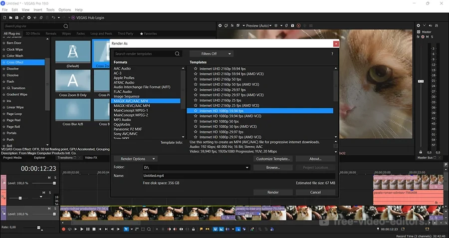 Перед экспортом можно добавить мелодию, наложить текст и многое другое. Когда вы закончите обработку, кликните «File» — «Render As». Подберите предустановку для вывода: есть варианты для адаптации клипа к сети, мобильным устройствам и профили для создания медиафайлов для просмотра на ПК. Затем укажите папку на диске и введите название документа.
