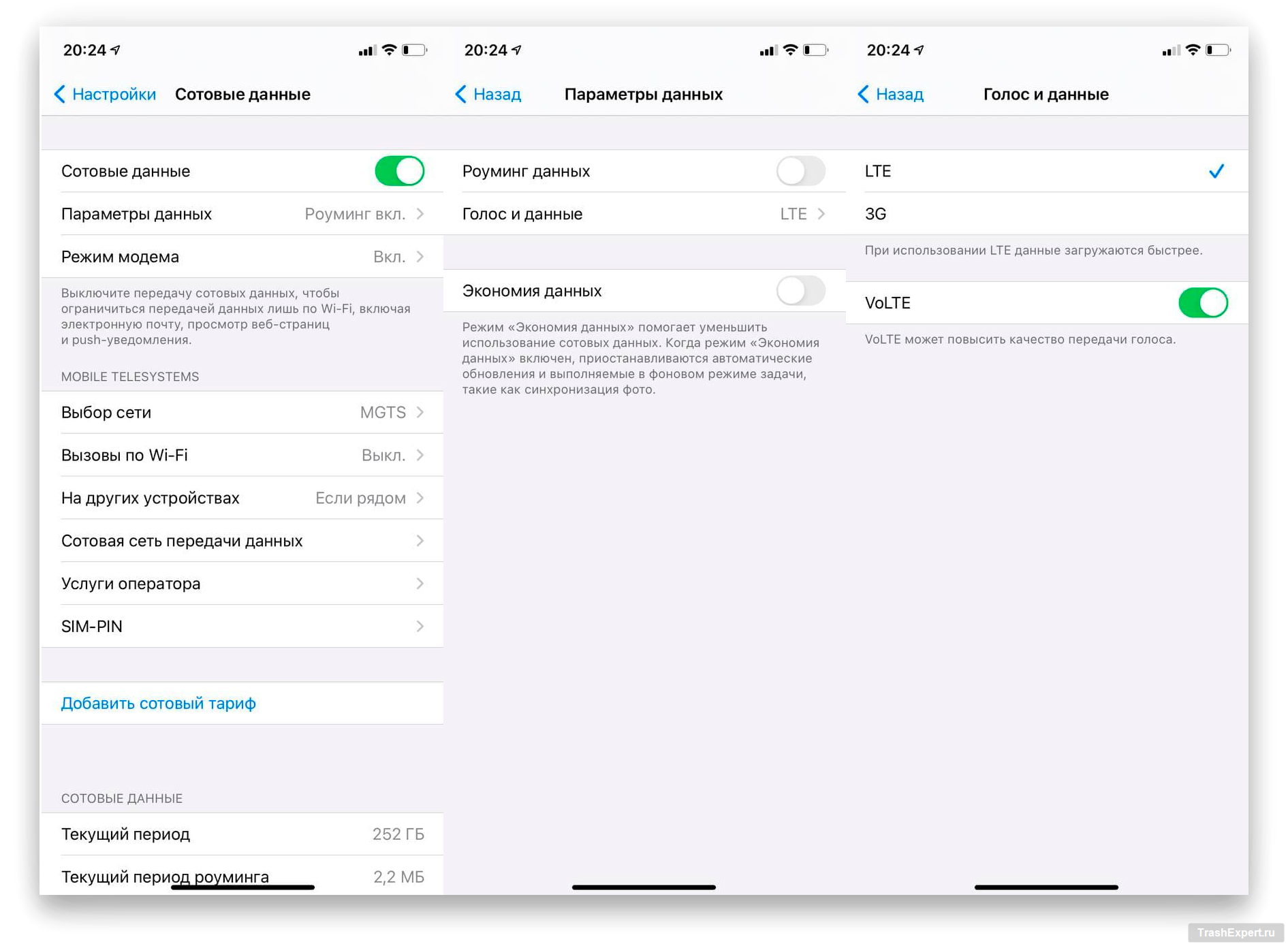 На iPhone перейдите в Настройки > Сотовая связь > Параметры данных > Голос и данные. Там можно выбирать между 5G и LTE (4G). В зависимости от сети может быть доступно и 3G.