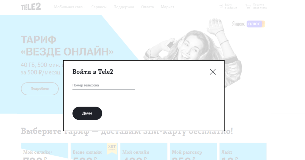 - Зайдите на сайт оператора Теле2 – login.tele2.ru.