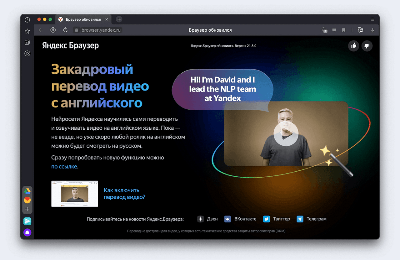 В сентябре данная функция была расширена. У людей появилась возможность для перевода роликов с английского языка на Ютуб, Вимео, ТикТок, Твиттер, Фейсбук и ВК. С ограничением на лицензионные видео, к примеру, сериал Netflix вы посмотреть не сможете. Сейчас, с выходом обновления в Яндекс браузере 21.11.1.932 данная функция начала работать более стабильно, о чём не забыл напомнить браузер.