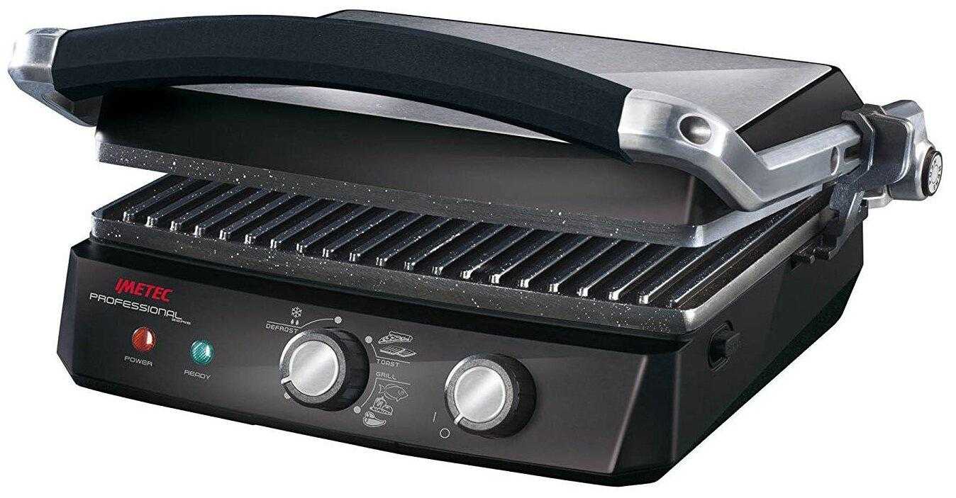 Здесь съемные панели, несколько вариантов приготовления пищи благодаря сразу трем позициям нагревающихся панелей: закрытая, открытая и с фиксацией на выбранном расстоянии для запекания. Есть плавный регулятор температуры, две независимые емкости для сбора жира.