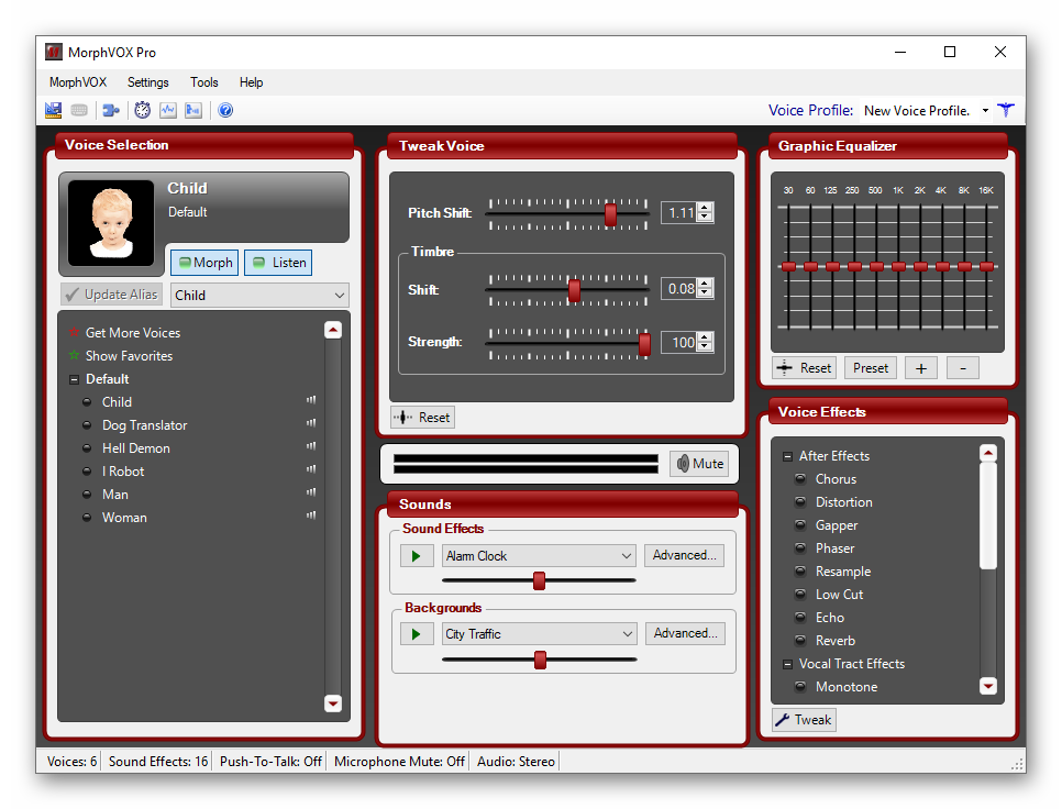 Эта разработка фирмы NCH используется для сохранения инкогнито в компьютерных играх и программах-«звонилках», так как она автоматически искажает голос, проходящий через подключенный микрофон. Софт совместим с большинством игровых платформ, что делает его отличным выбором для геймеров. Работа проводится в двух режимах: разрешает менять установки вручную или выбрать готовый фильтр. Среди встроенных стилей присутствуют мужчина и женщина, робот, инопланетянин и много других.