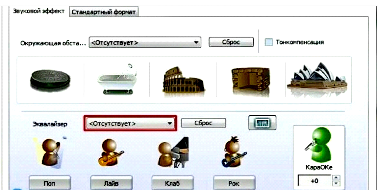- Опция «Окружение» служит для настройки звуковых эффектов под окружающие условия. Здесь можно выбрать опции «Маленькая комната», «Средняя комната», «Большая комната», «Самая большая комната» и т. д.