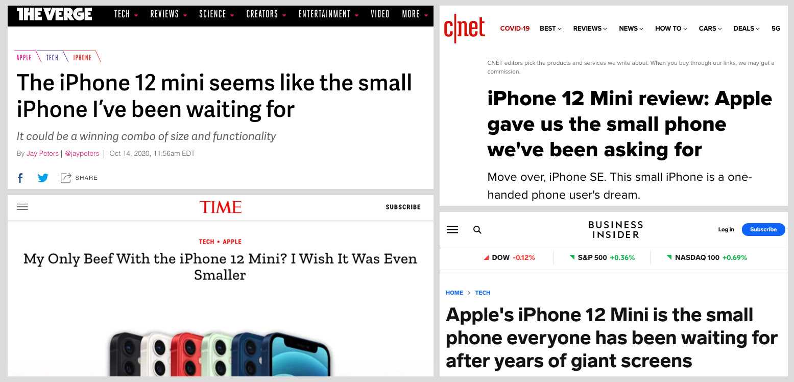 Заголовки сайтов, посвящённые iPhone 12 mini в дни начала продаж. Все в восторге, ведь «все такой ждали».