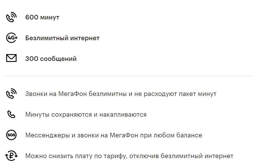 На звонки за пределами сети даются 600 минут. Помимо этого, в пакет входят 300 сообщений. Фишка с переносом минут и возможностью пользоваться мессенджерами и совершать звонки внутри абонентам Мегафона даже при отрицательном балансе тут тоже есть.