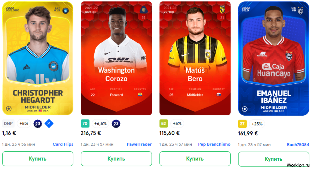 Цена зависит от редкости, прокачки и изображенного спортсмена. Самые крутые продаются по миллиону долларов. Карточки здесь дают и за привлечение рефералов, нужно пригласить 5 человек, которые купят 5 карт, чтобы дали 1 желтую карту, а за 30 активных рефералов дают коричневую карту (самая редкая).
