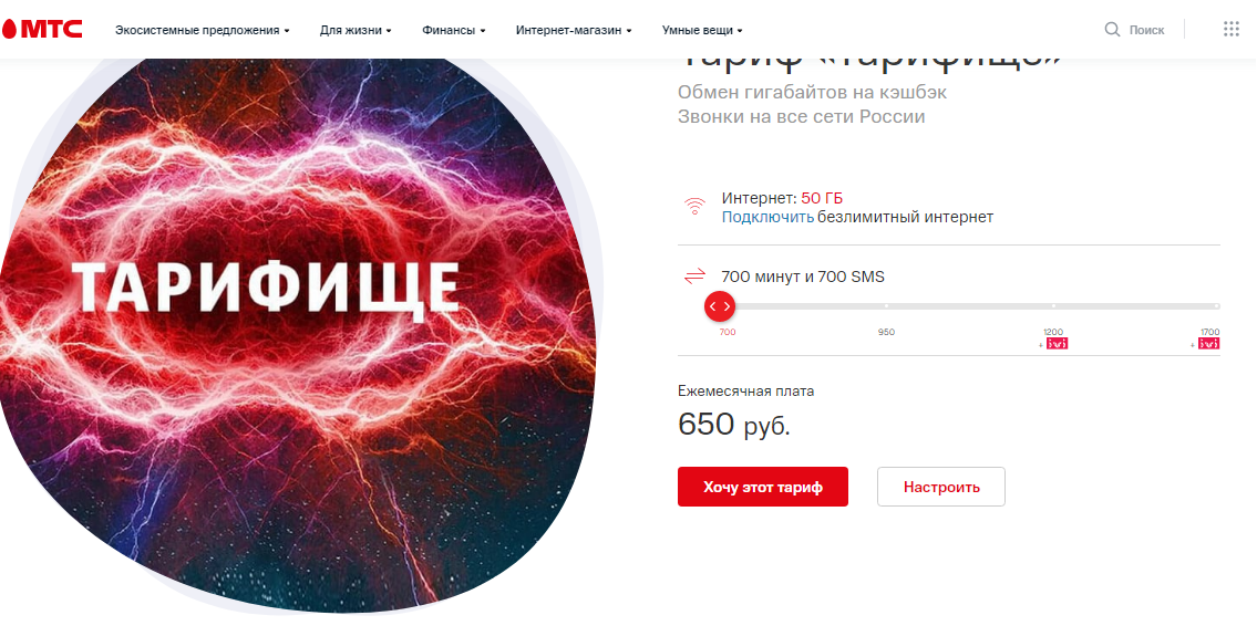Условия для тарифа от МТС «Тарифище» Мода на тарифы-конструкторы коснулась и плана «Тарифище». Конечно, до гибкости Yota здесь очень далеко, но кое-что пользователь может настроить под себя. Прежде всего, можно выбрать размер пакета минут и СМС, от чего напрямую зависит месячная абонплата: