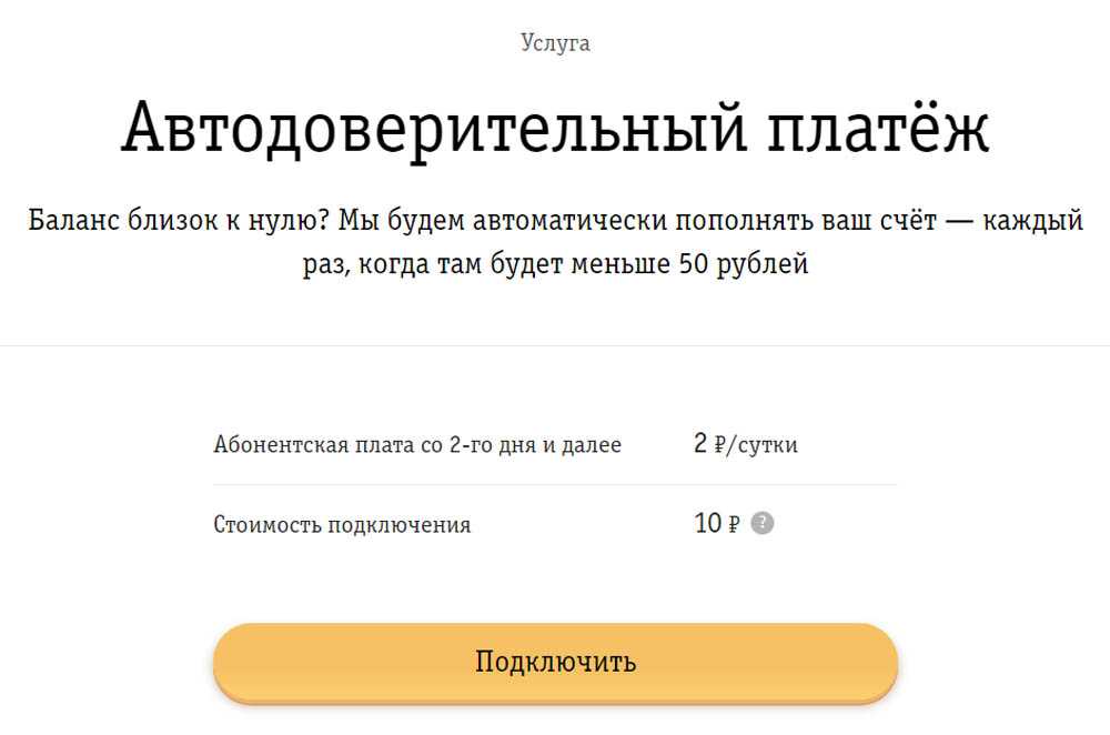 Если баланс опустится ниже 50 рублей, услуга «Автодоверительный платеж» пополнит счет абонента с его расчетной карты.