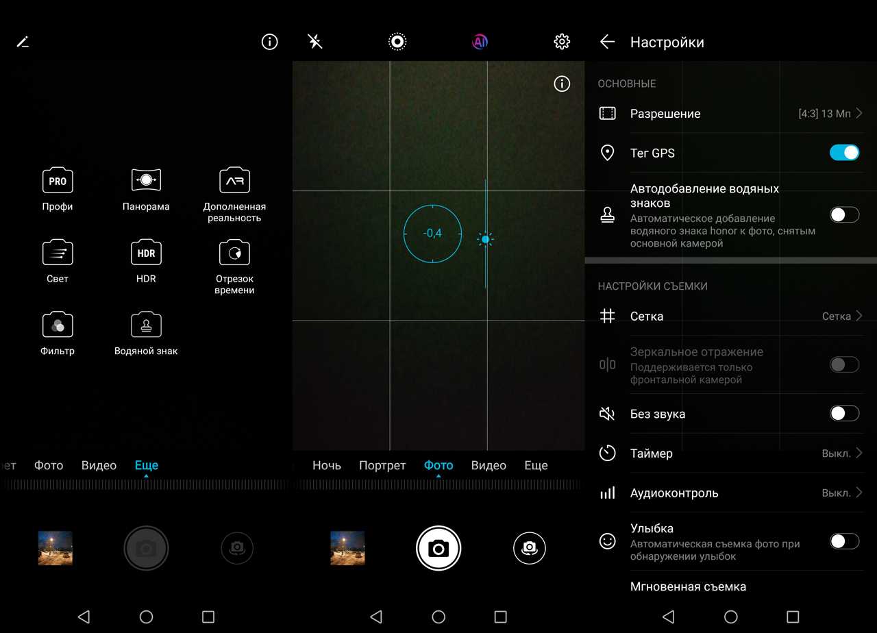 Здесь есть продвинутые ручные настройки и режим ИИ, в котором нейросеть определяет сюжет фотографии и выставляет наиболее подходящие параметры. Помимо классических режимов «Диафрагма», «Ночь», «Портрет», «Фото» и «Видео», есть вкладка «Про», где можно выставлять настройки вручную. Там же находятся панорама и различные эффекты, включающие съёмку таймлапсов, маски, подмена фона и наложение музыки.