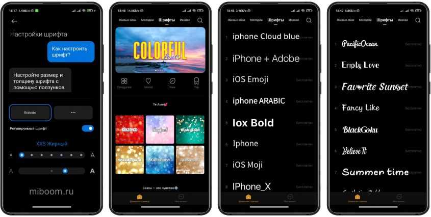 По умолчанию в MIUI используется шрифт Mi Sans, который также претерпел изменения. Немного изменилось начертание, шрифт был доработан для более качественного отображения на AMOLED экранах. Есть возможность изменить размер шрифта (от XXS до XXL), а также изменить толщину написания. В разделе «Обои и персонализация» можно скачать дополнительные шрифты для того, чтобы немного кастомизировать интерфейс MIUI.