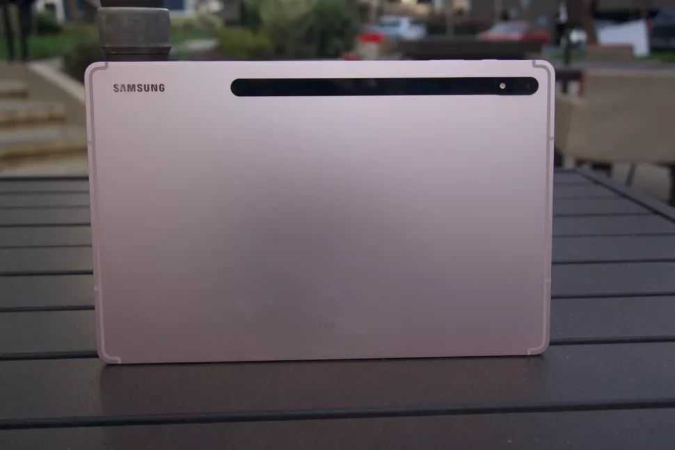 The Galaxy Tab S8 is the entry-level model of its generation, but it doesn’t feel like it. The Pink Gold color scheme on our review unit adds an elegant sheen to the tablet’s slim, light chassis.