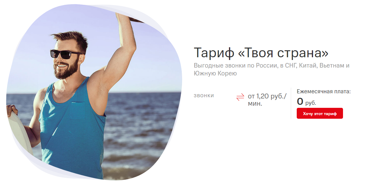 Он пришел на ушедшему в архив предложению «Твоя страна». Тарифный план предоставляет возможность экономно звонить в страны СНГ, Азию и по России. Звонки по России – от 1,10 рубля в минуту. При этом есть особенности в расценках на связь: