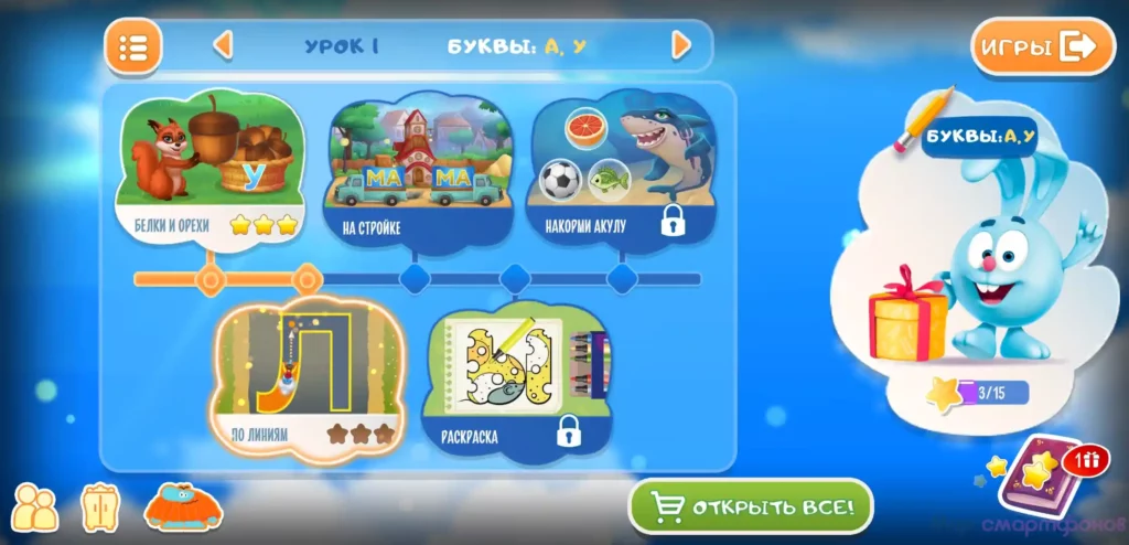 Под названием «Сказбука» скрывается целый игровой комплекс, который позволяет ребенку играть и получать различные навыки. В списке игр – задания, повышающие уровень знаний по математике, чтению и английскому языку. Рекомендованный возраст для использования приложения – от 2 до 7 лет. Есть версии для ОС Android и для iOS, платные и бесплатные варианты.