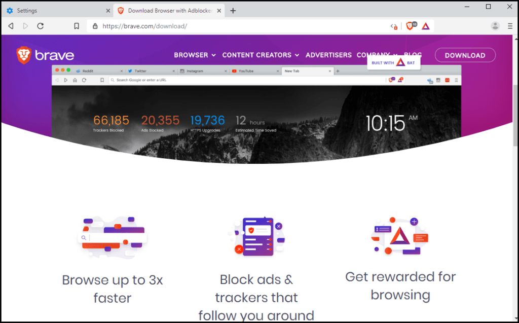 Brave — это бесплатный веб-браузер, который удаляет рекламу и трекеры с веб-сайтов. Он работает на Windows, Mac OS, Linux, Android и iOS. Он предоставляет веб-сайтам и создателям контента механизм получения микроплатежей в виде BAT (Basic Attention Tokens) — децентрализованной платформы обмена рекламой с открытым исходным кодом, основанной на Ethereum.