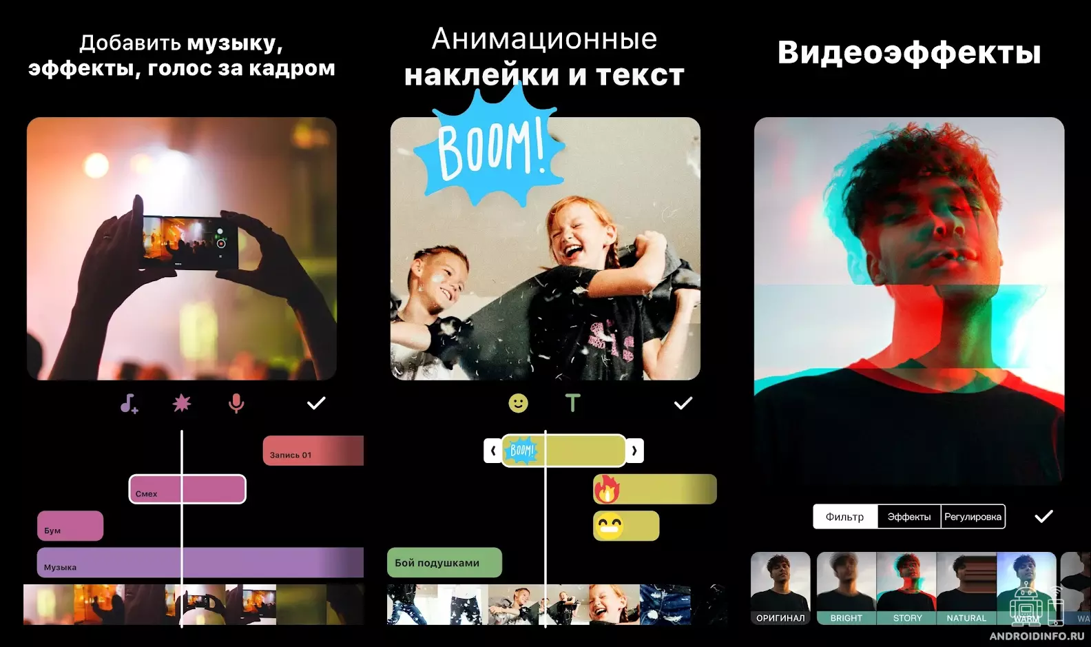 Одно из самых полезных приложений для начинающих блогеров: множество эффектов для создания музыкальных и кинематографических клипов или слайд-шоу из видео и фотографий. Отдельный плюс – на отредактированном контенте не остаётся водяных знаков.