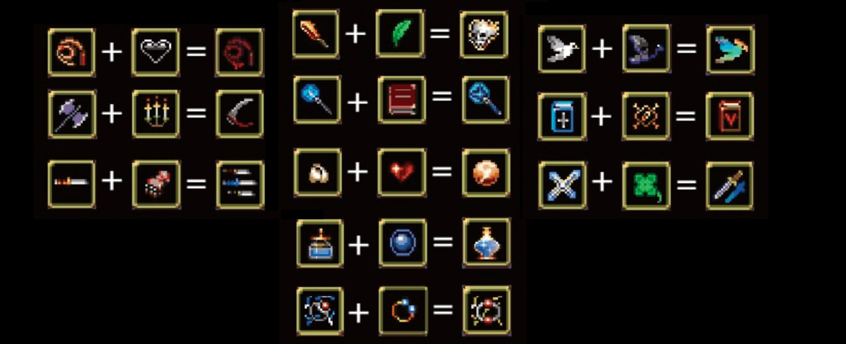 Есть и специальная синергия: Никак не синергируют следующие предметы: Пентаграмма, Маска, Часы Ланцет, Лавр, Кость, Телега. Зато их можно неплохо прокачать и без синергий.