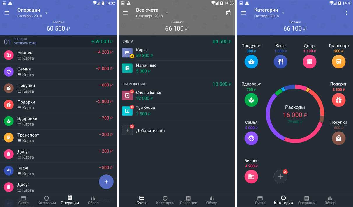 Этот простой и удобный в использовании сервис обладает обширным набором возможностей для ведения бюджета, за что снискал высокую популярность у русскоязычной аудитории. Он предлагает учет доходов, чтобы знать на какую сумму стоит рассчитывать через месяц или год, и расходов, благодаря чему можно определить какие покупки являются целесообразными, а какие нет.